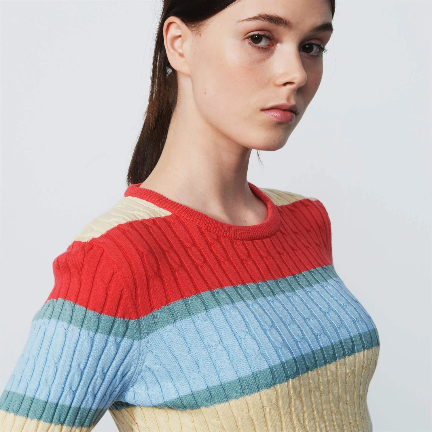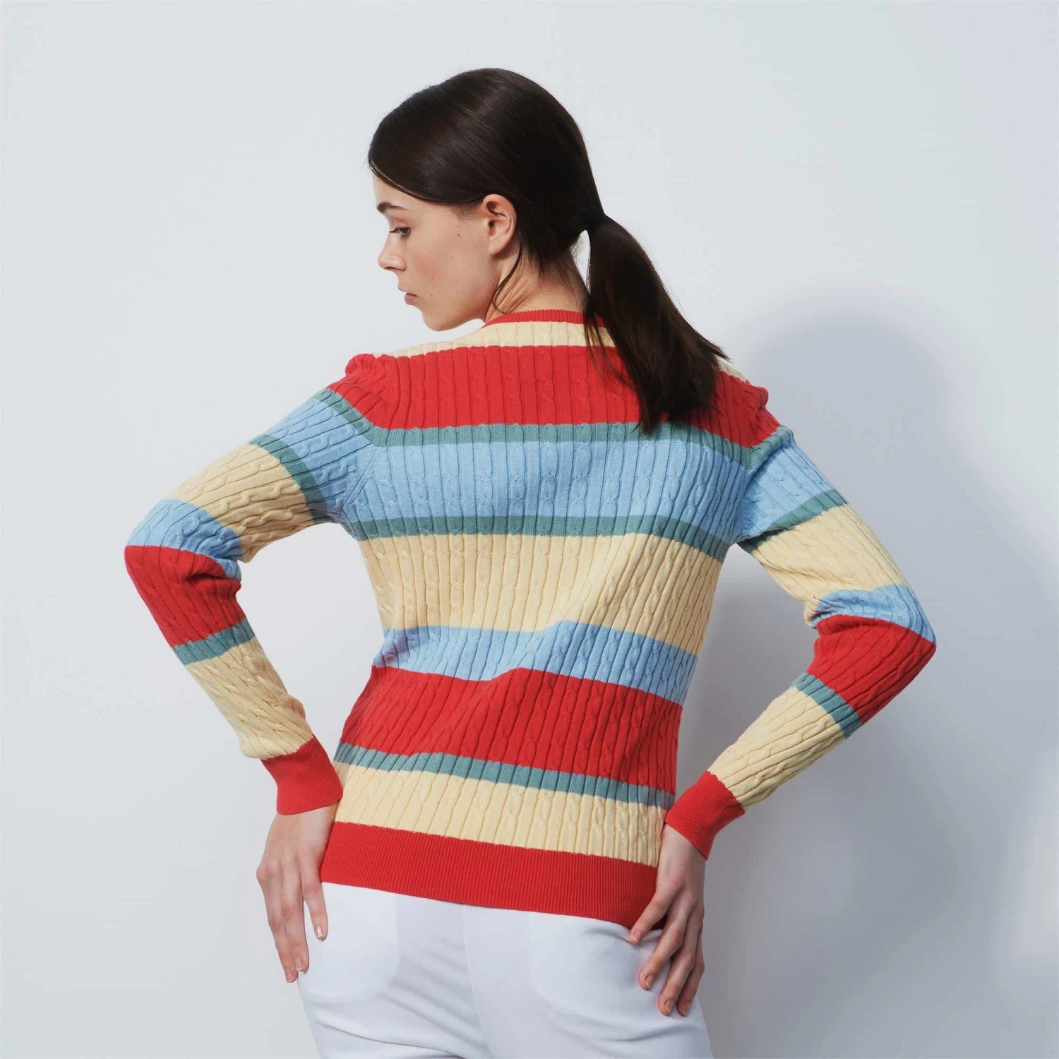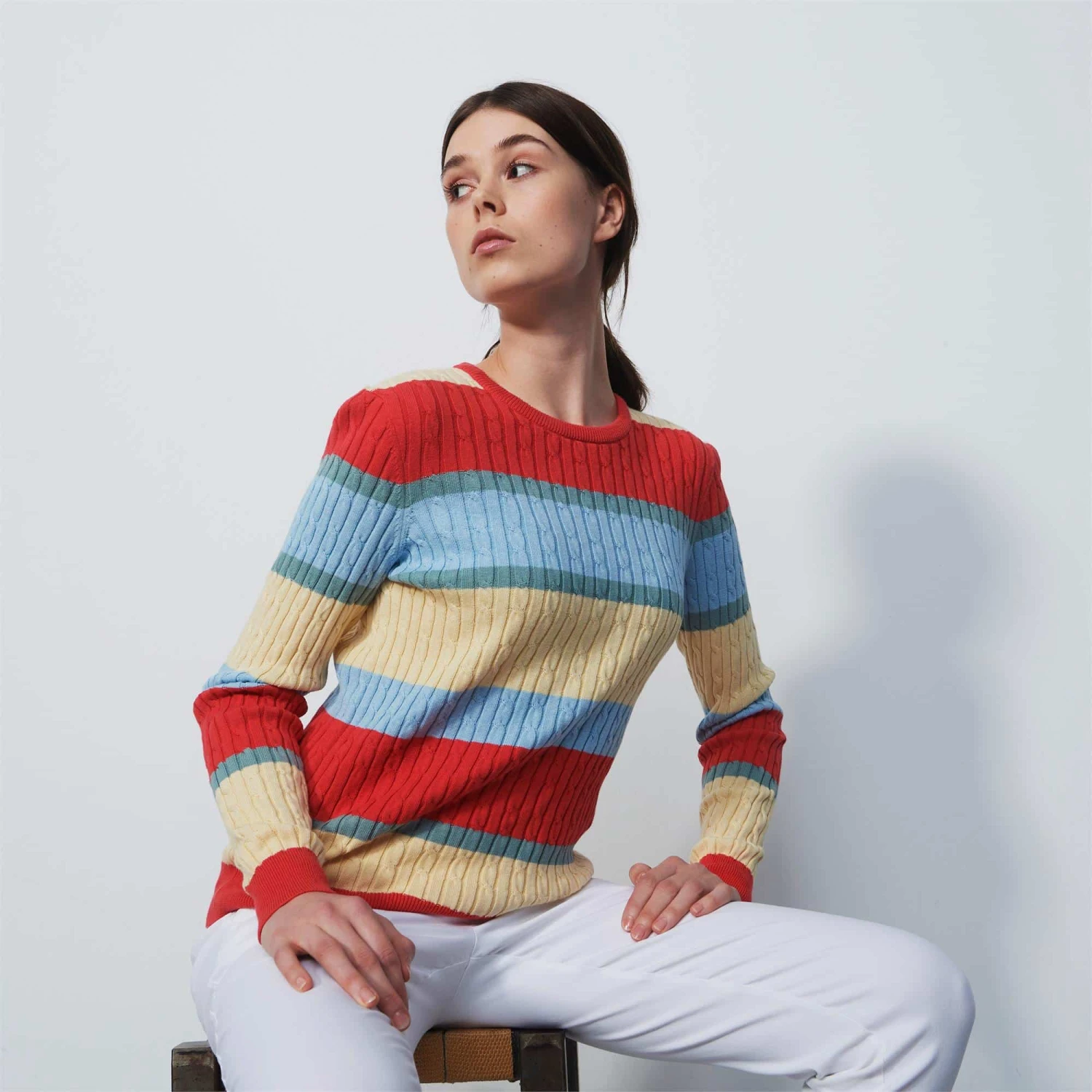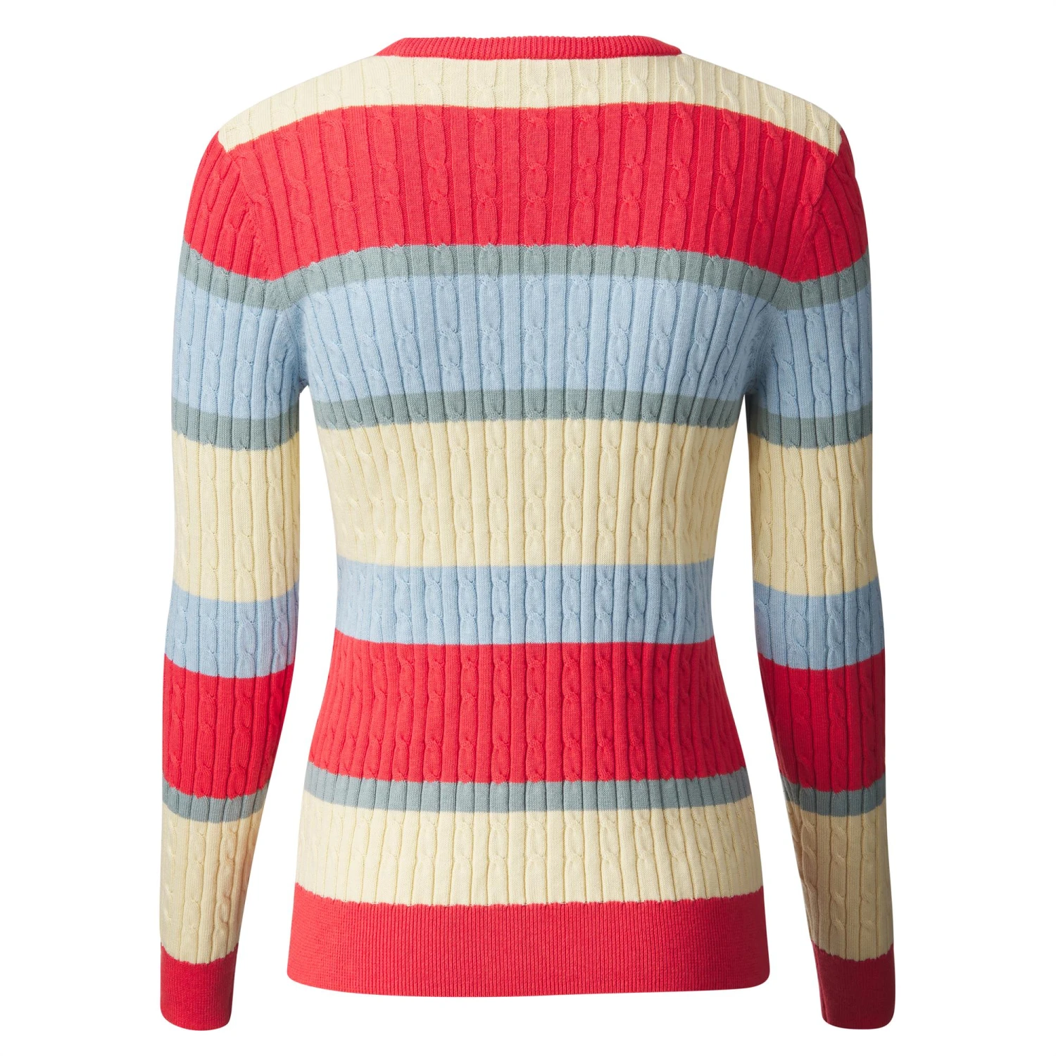The Olbia is a striped pullover in vibrant colours, with a flattering fit and a round neck, perfect for both on and off the golf course. It features a classic cable knit in cotton and cashmere with ribbed cuffs, whilst additional detailing is provided by the metallic Daily Sports logo on the front right of the pullover. This versatile pullover combines comfort with a stand-out look making it the perfect, colourful addition to your summer wardrobe.