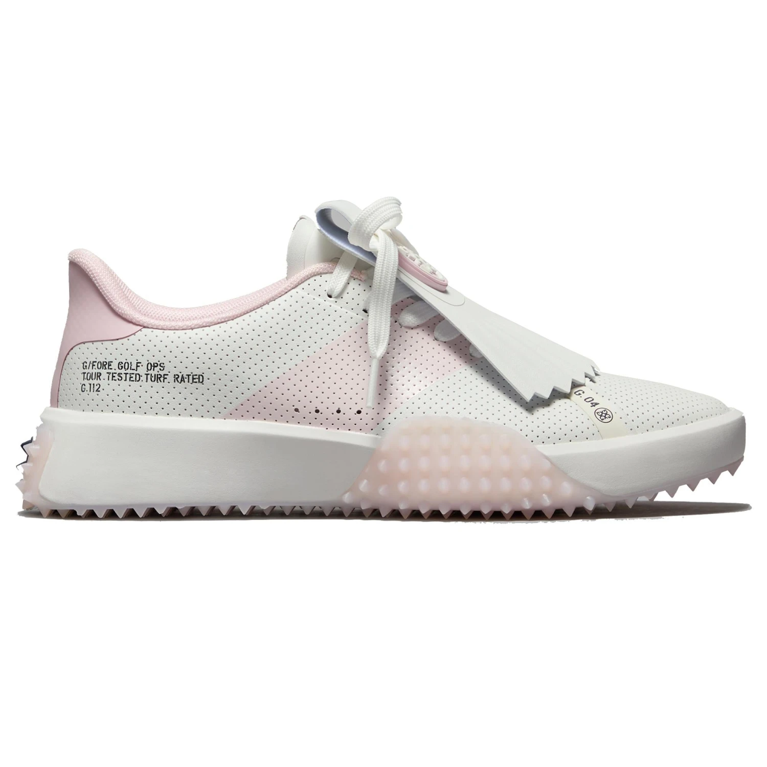A best-selling ladies golf shoe G/FORE, the G.112 is a multi-functional shoe that takes you from the street to the course with ease. The G.112 features a cushioned interior for optimum comfort, whilst mobility and stability are guaranteed by the seamless synthetic upper & single rubber outsole which ensure no compromise to performance in any conditions. The perforated styling of this shoe also allows airflow to the feet for enhanced comfort levels. With comfort assured this eye-catching aesthetic is further elevated by the detachable kiltie enabling the wearer to mix & match styles depending on their mood, these shoes are guaranteed to enhance performance as well as get you noticed on the fairways this season!