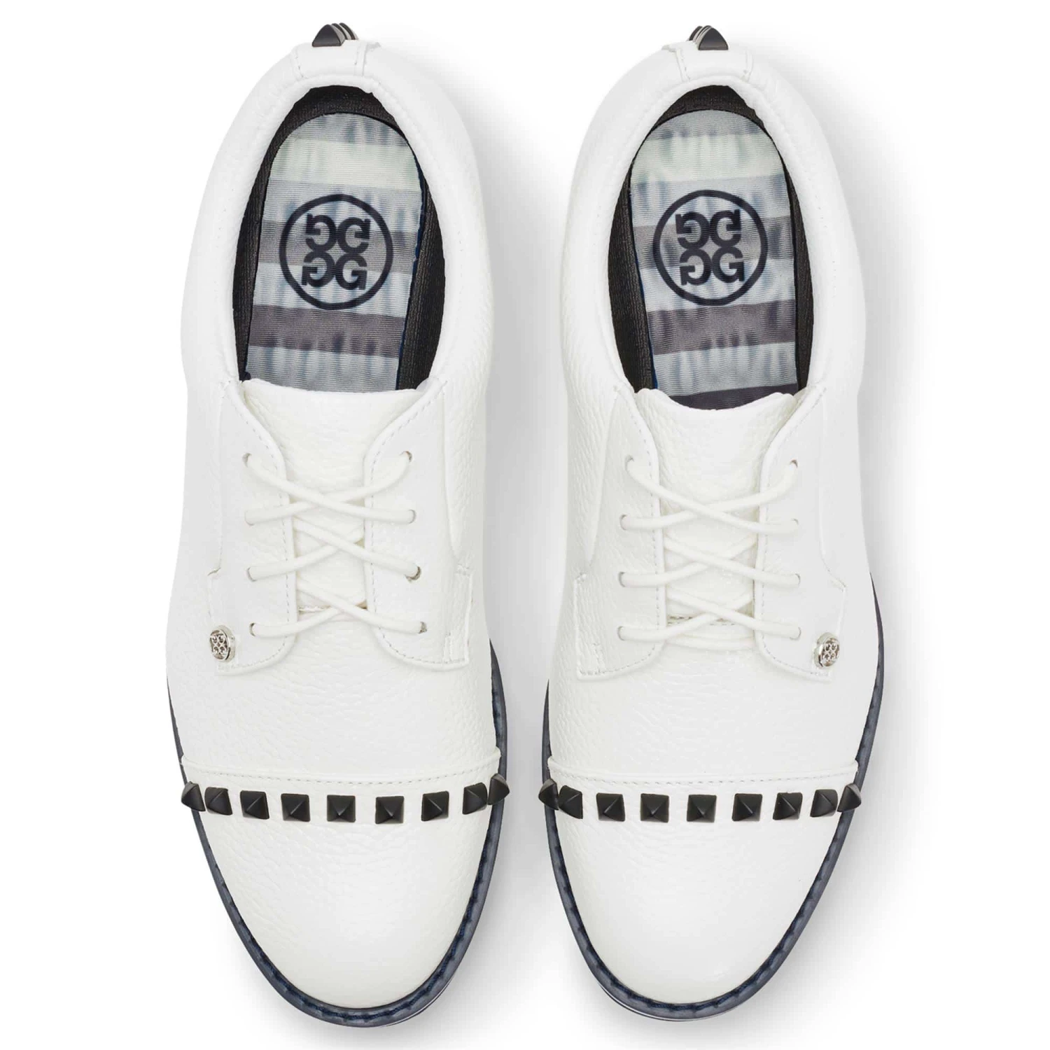 As stylish as they are comfortable, the ladies Gallivanter golf shoe combines an athletic fit with premium waterproof leather with signature G/FORE style. This particular style features diamond rubber studs on the toe cap. Custom designed by G/FORE’s team of footwear experts, the Gallivanter an ultra-lightweight sole coupled with a bespoke cleat design for optimal on-course traction. This shoe also sports a new, washable, and anti-microbial, triple density foam cushion sock liner for superior comfort. This shoe ensures a balanced combination of both style and performance on the course.