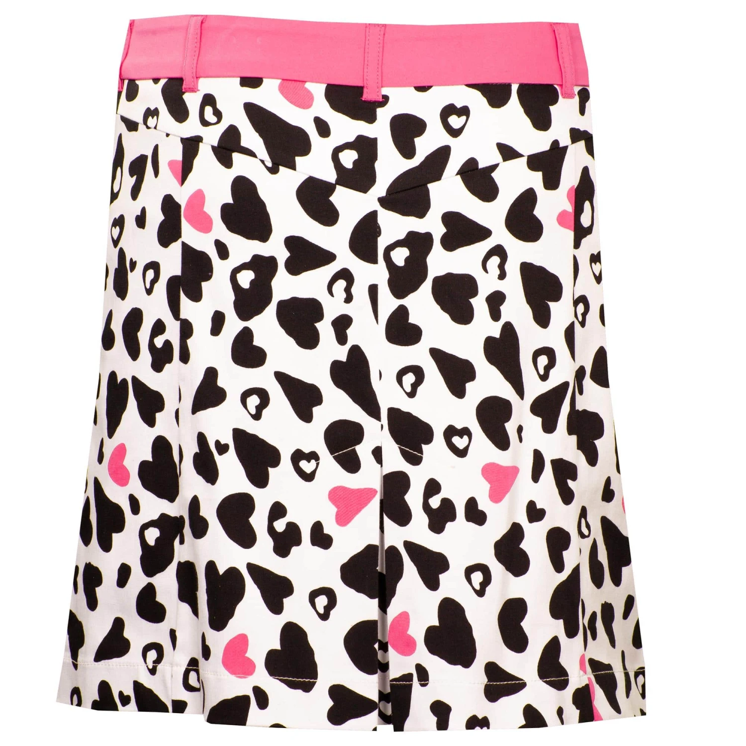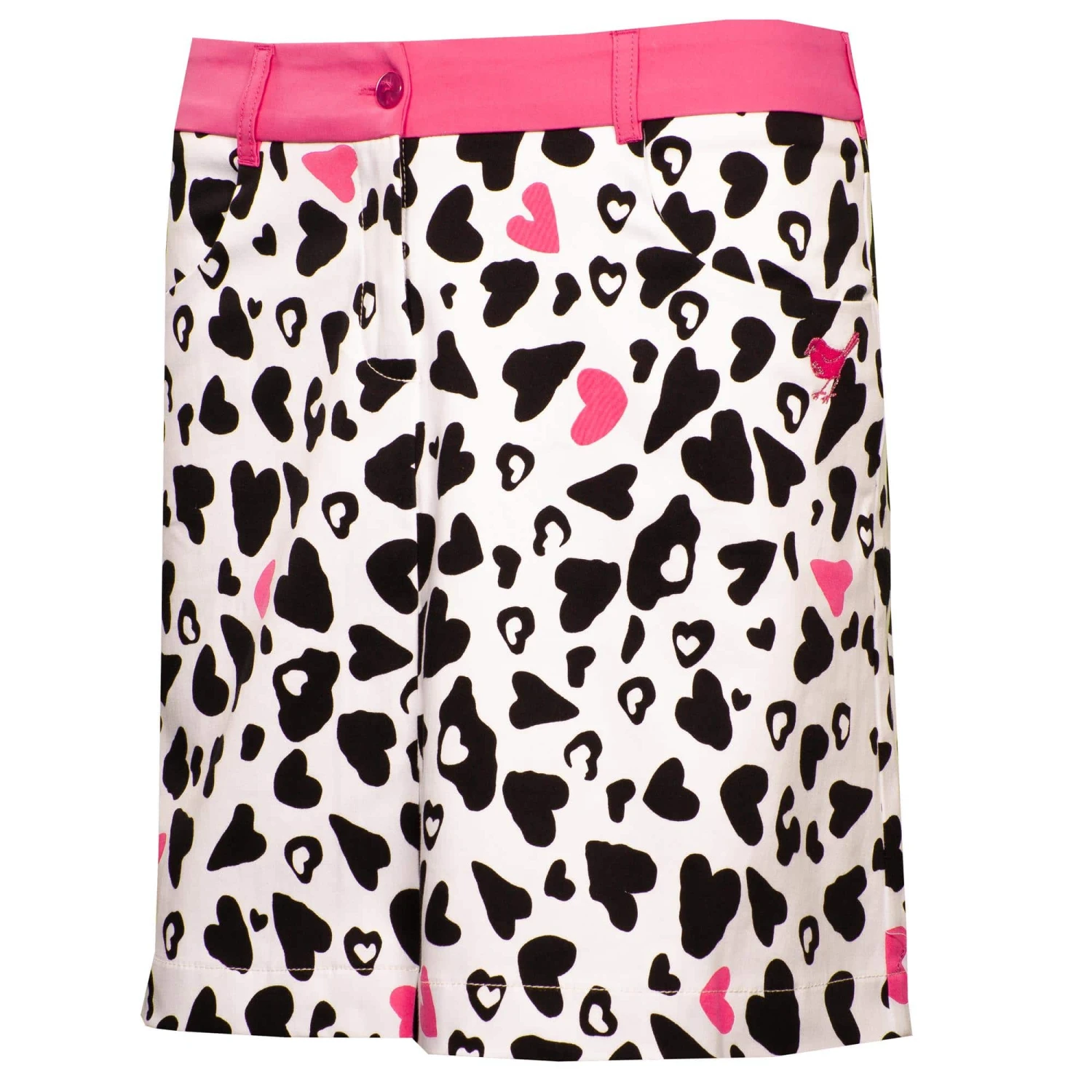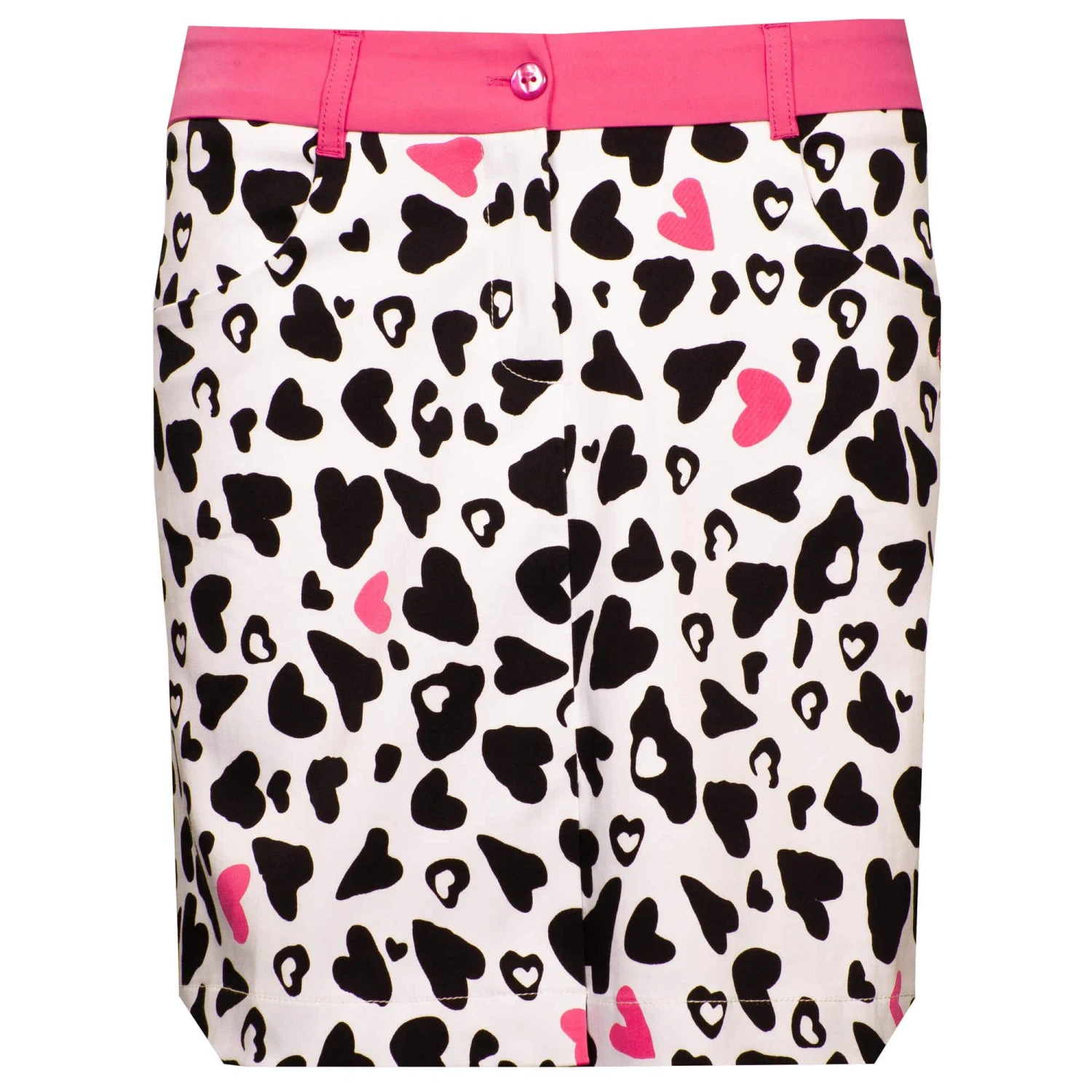 Tick the statement box with the Girls Golf Ladies skort in stretchy cotton , Gloriously colourful with an allover heart print and contrast pink waistband , elaborate stitched panelling on the rear of the skort finished with front and reat pockets