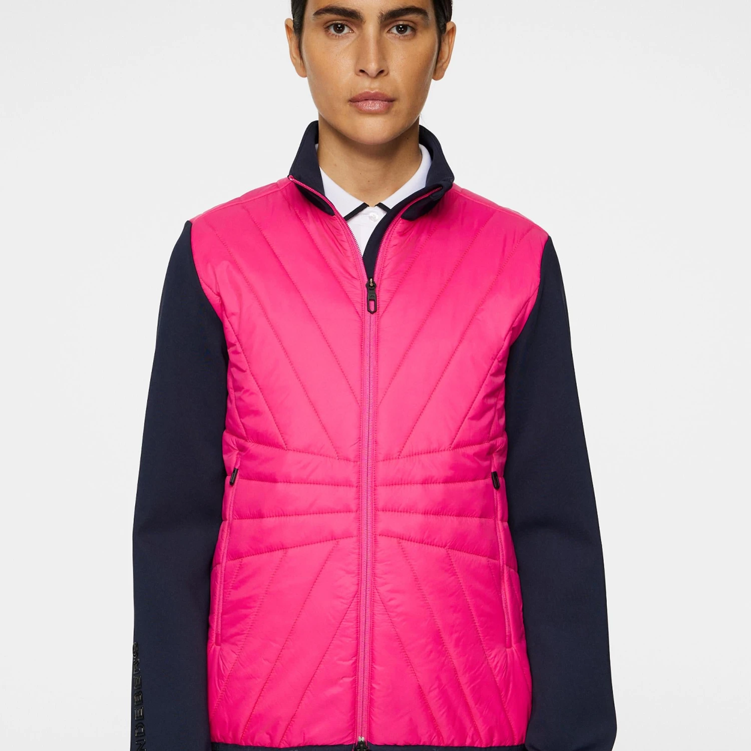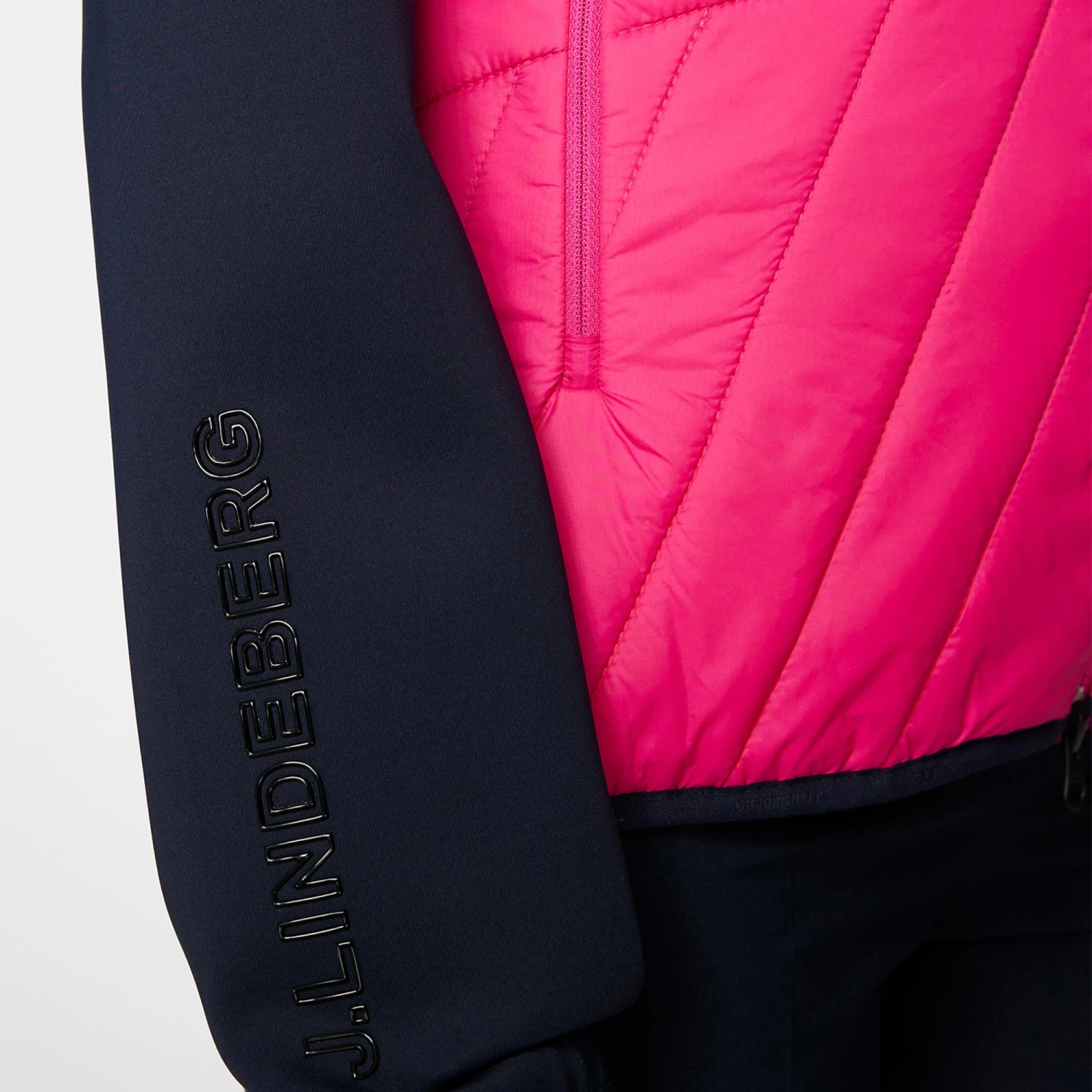 The Holma from J Lindeberg is a hybrid jacket, perfect for cooler conditions whether worn on or off the golf course. Crafted in double jersey with front and back parts, the front features a new seasonal quilted pattern whilst the back is constructed from a soft stretch fabric designed to ensure freedom of movement when the wearer swings. With detailing elevated by the JL bridge logo which can be found at the collar as well as the J Lindeberg, which is printed on the right sleeve, the Holma jacket is perfect for unpredictable conditions all year round.