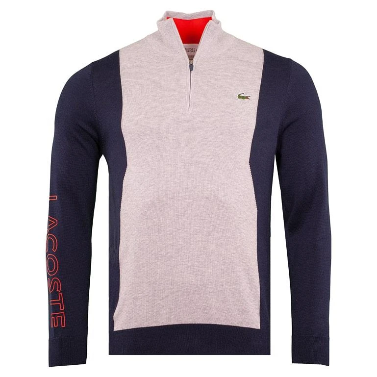 Hit the golf course in colourblock style. Featuring a 3D Lacoste wording on the sleeve, this zip-neck sweater with a high, stand-up collar will keep you comfy yet elegant in Coolmax breathable cotton knit. A winning piece that wicks away moisture.
