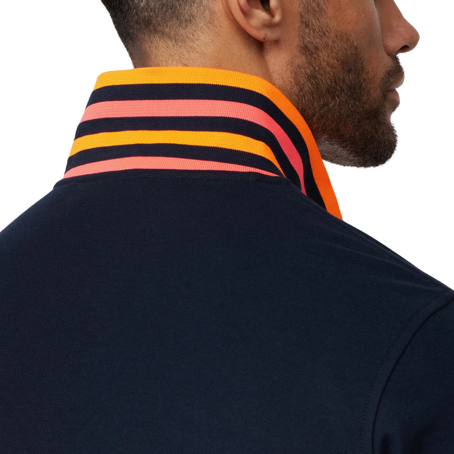 - Distinctive striped undercollar