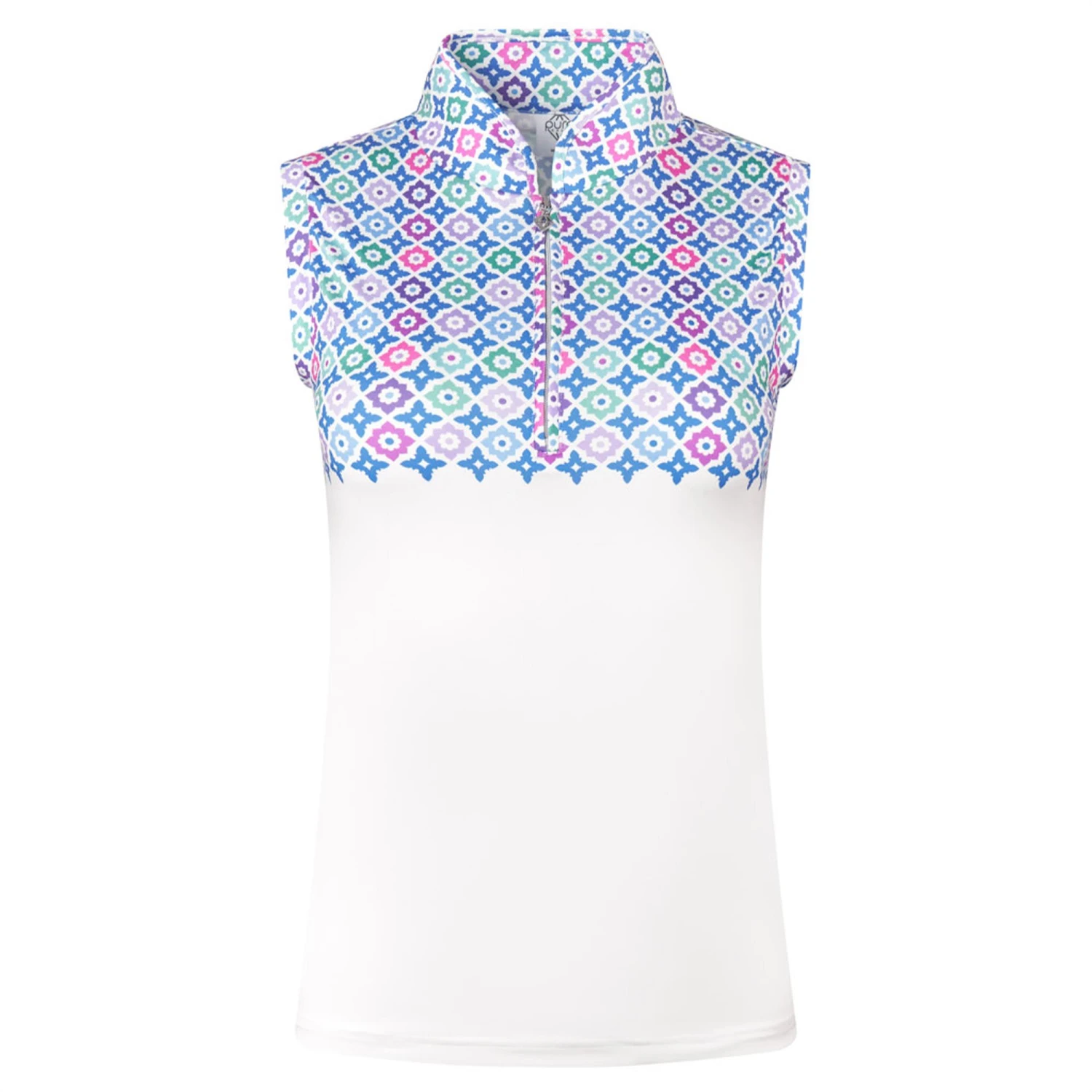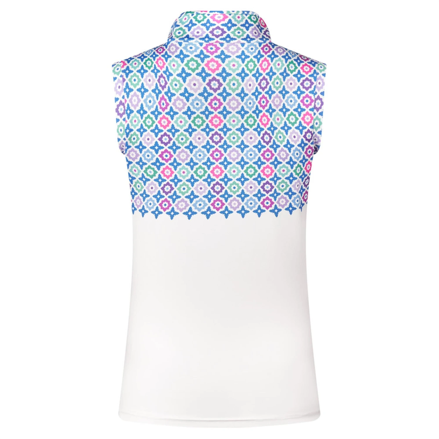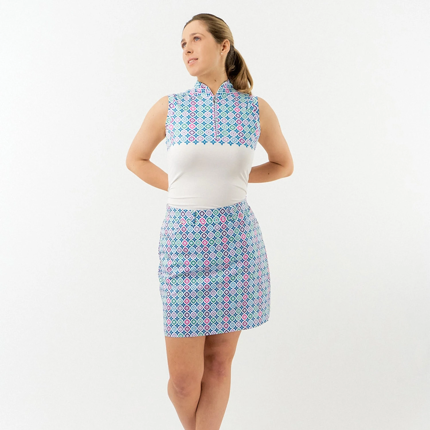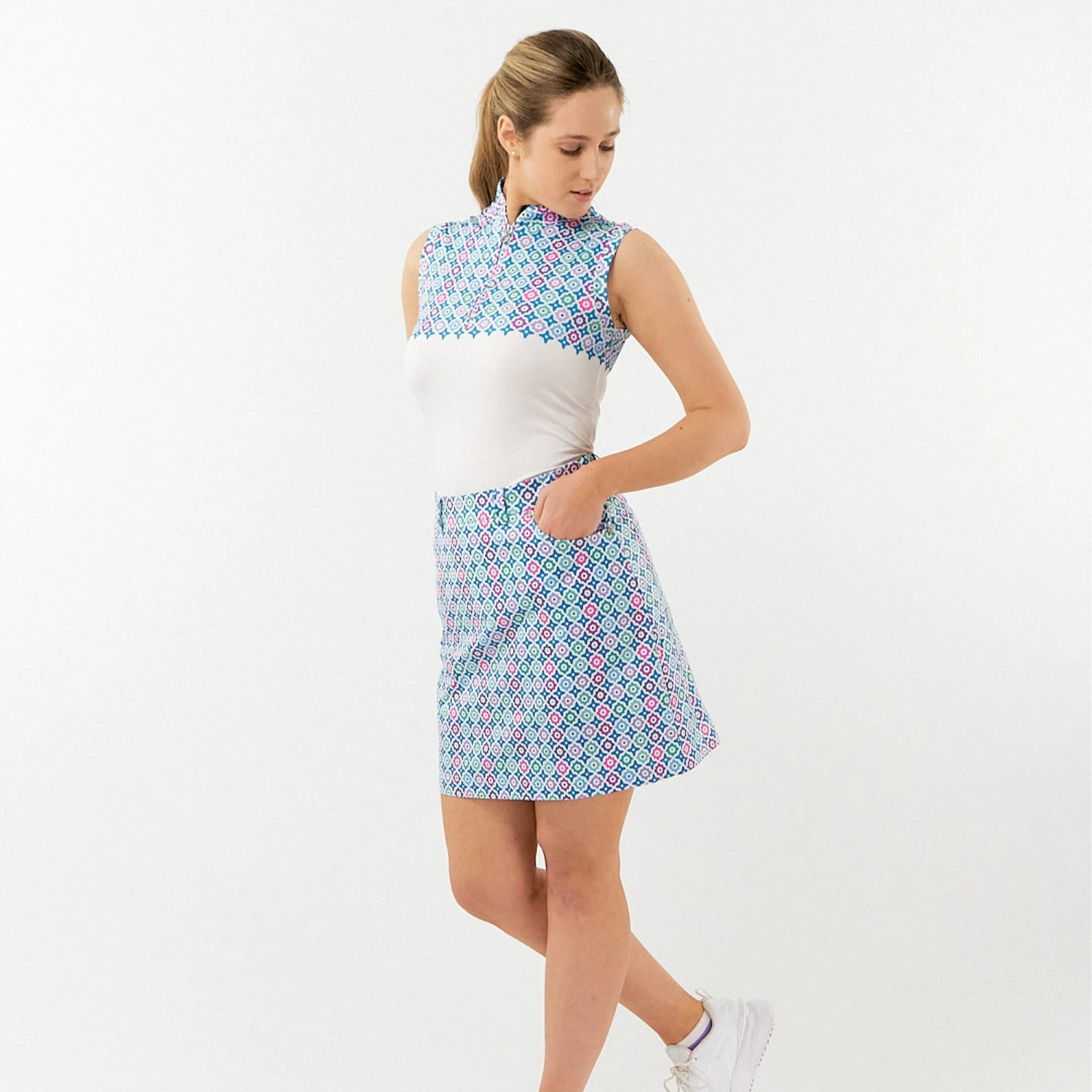 The Truth sleeveless zip top from Pure Golf is a versatile partial print, sleeveless zip top made from anti-static, anti-crease, 4 way stretch and quick drying fabric with built in UVA+UVB sun protection with UPF 35 to block harmful rays on the course. This top guarantees a great look when worn with either plain bottoms or a patterned skort subject to the wearer’s taste. Deliberately designed to integrate seamlessly with the Geoflower fashion collection other garments & accessories from our spring/summer 23 range.